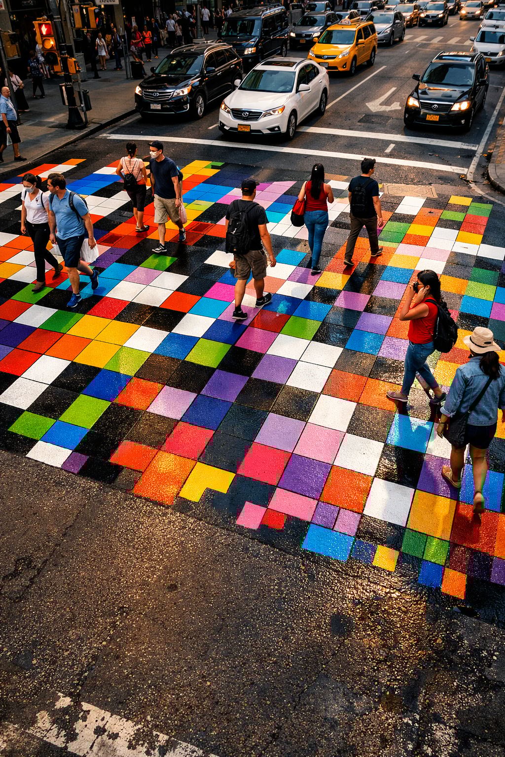 Inside a sleek, mirrored elevator with soft ambient lighting, a group of people stands quietly as the doors begin to close. Just before they shut, the back wall display lights up with a bold, ultra-clean visual of [your concept] — rendered as a striking, photorealistic graphic or object that feels out of place in such a confined space. The reflections multiply the image infinitely across the mirrored panels, creating depth and visual tension. Subtle colored lighting (deep blues, warm ambers, soft magentas) enhances the scene. Shot from a cinematic eye-level angle with sharp focus, crisp reflections, and high-end realism — capturing a fleeting, powerful moment of attention in an otherwise ordinary setting.